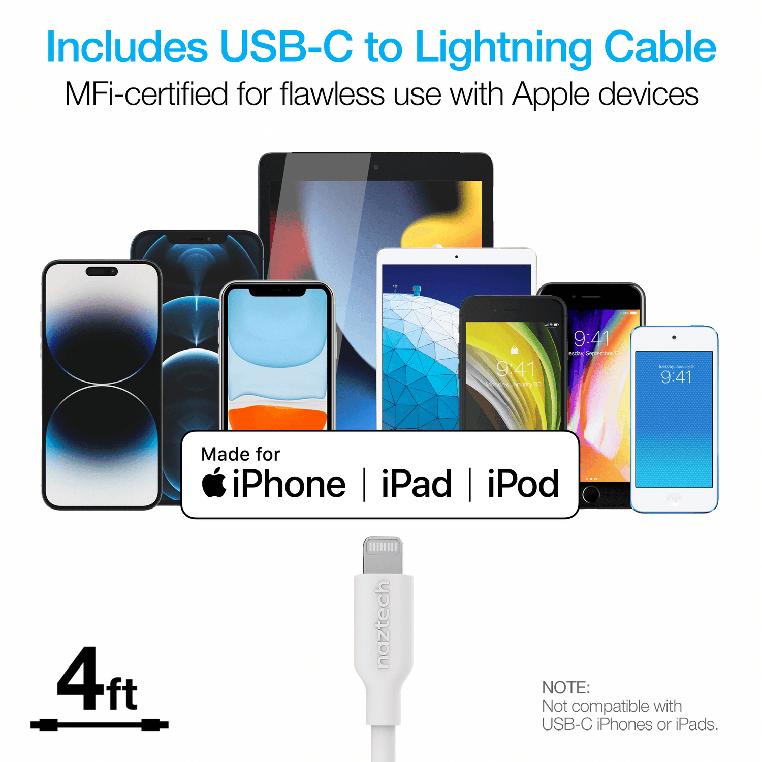 With the included 4ft USB-C to Lightning cable, this all-in-one charging kit lets you power your Apple devices at maximum speed while on the go. (Vehicle not included.)