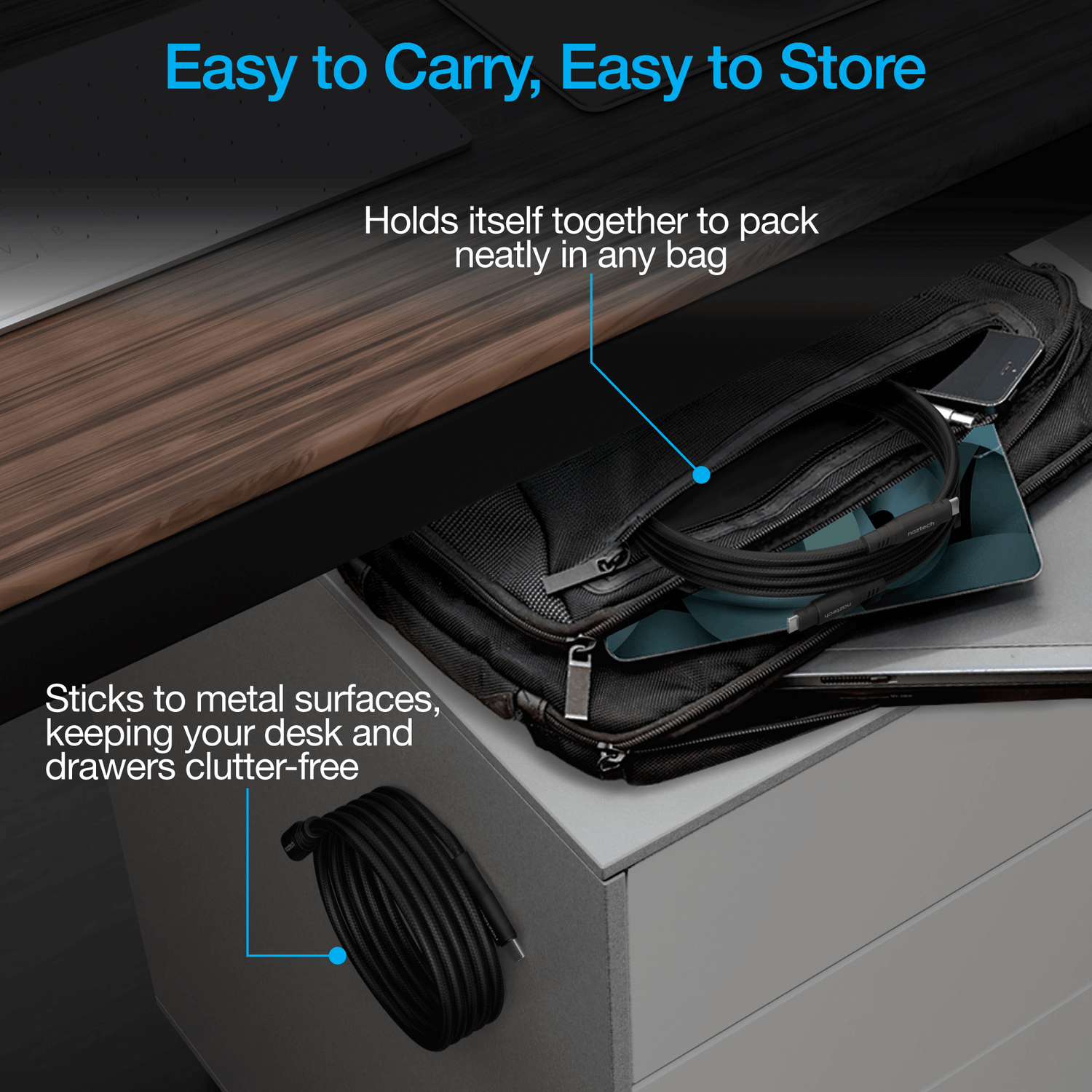 Experience hassle-free charging with the REcoil cable from Naztech – a revolutionary magnetic USB-C cable that stays coiled when you need it and lies flat when you don’t. Designed with a full-length magnetic feature, the cable naturally sticks together, keeping itself organized and tangle-free wherever you store it—whether in your bag, car, on your desk, or in your drawer. You can even attach it to the side of your metal filing cabinet for a clutter-free workspace. When it’s time to charge, this ultra-soft, ultra-flexible cable easily lays flat, preventing any twisting or tangling as you plug in.
