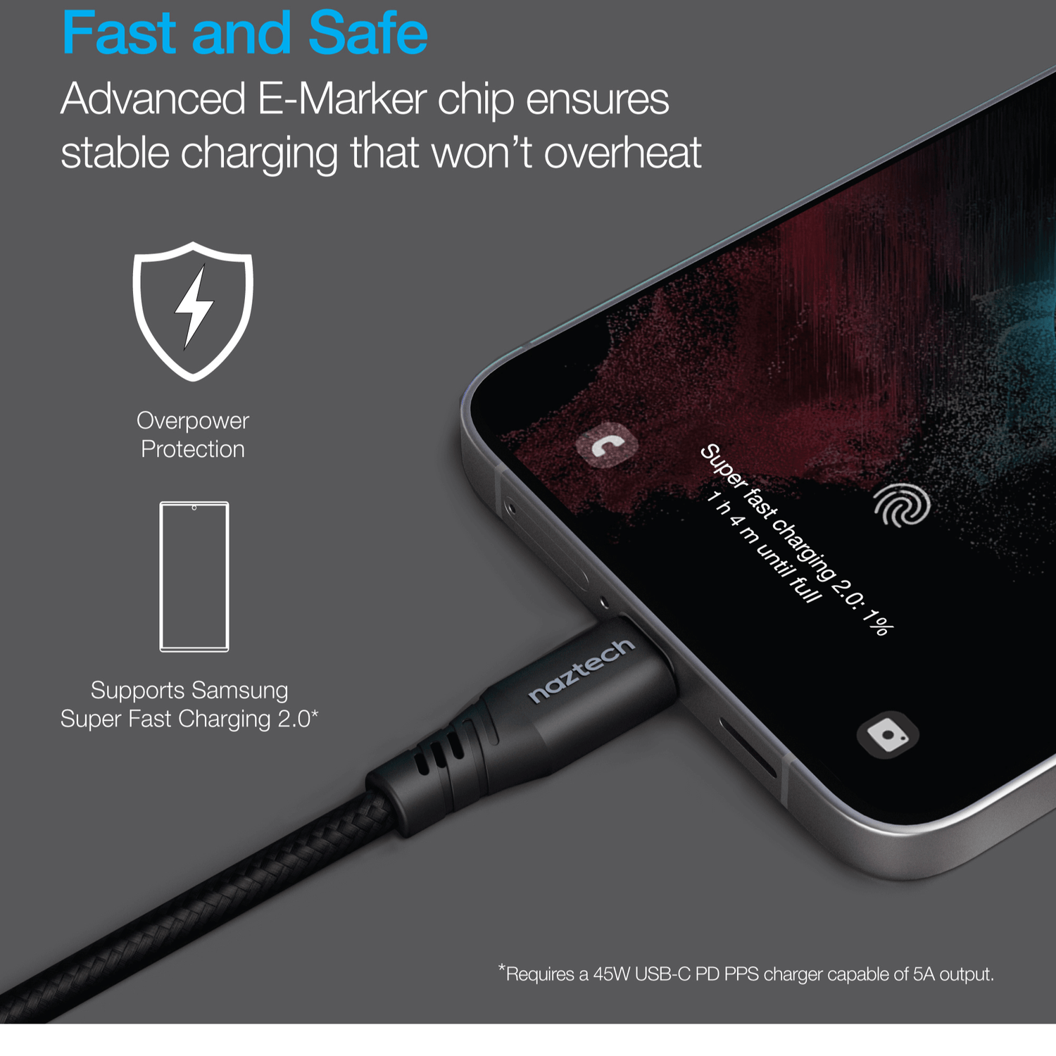 - Advanced E-Marker Chip Ensures Fast and Safe Charging