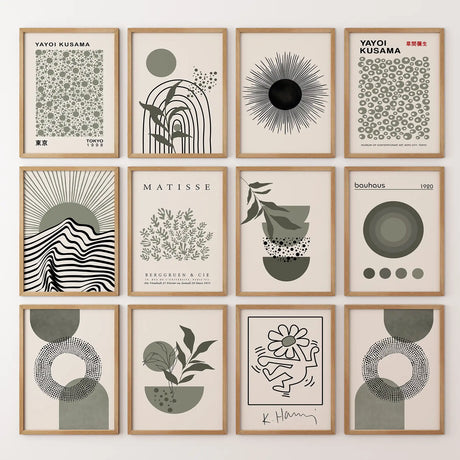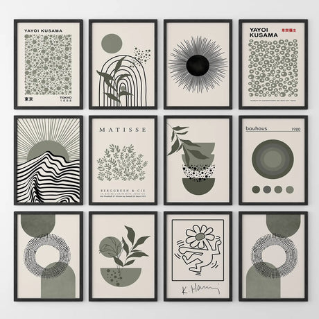 Set of 12 Sage Green Art. Abstract Matisse, Bauhaus MCM Prints