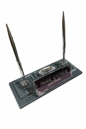 This desk name holder is produced specially by using black clear glass and combined with golden pen set and glass name holder base on it with golden plate