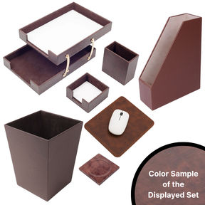 Style meets structure with this elegant all-in-one desk set designed to elevate any workspace. Crafted from high-quality faux leather and soft interior lining, this set includes everything from trays to trash bins to keep your desk refined and clutter-free.