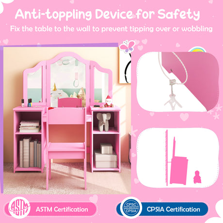 Kids Vanity Table and Chair Set with Removable Tri-Folding Mirror