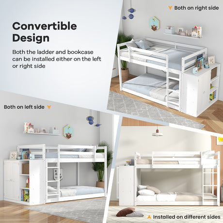 Twin Size Bunk Bed with Convertible Bookcase and Ladder-White