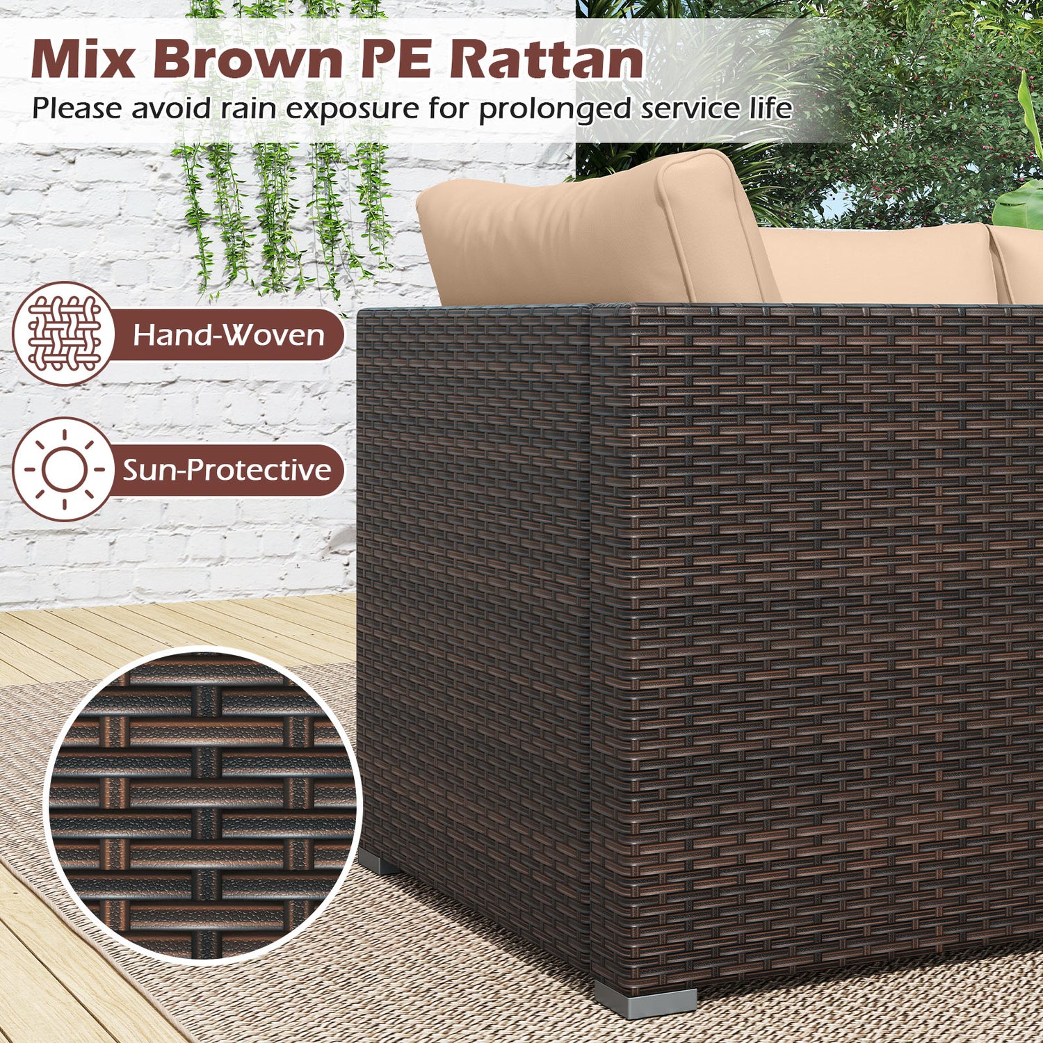 Color of Rattan Mix Brown Color of Cushion Beige/Grey/Navy Materials PE Rattan Metal Polyester Sponge Dimensions of Each Arm Sofa 26.5" × 26.5" × 24.5" Dimensions of Each Armless Sofa 23.5" × 26.5" × 24.5" Size of Each Back Cushion 23" × 13.5" × 5" Size of Each Seat Cushion 23" × 23" × 2.5" Seat Height with Cushion 15" Total Net Weight 55 lbs Weight Capacity of Each Sofa 400 lbs Is Assembly Required Yes Box Qty 1 (may vary by batches)