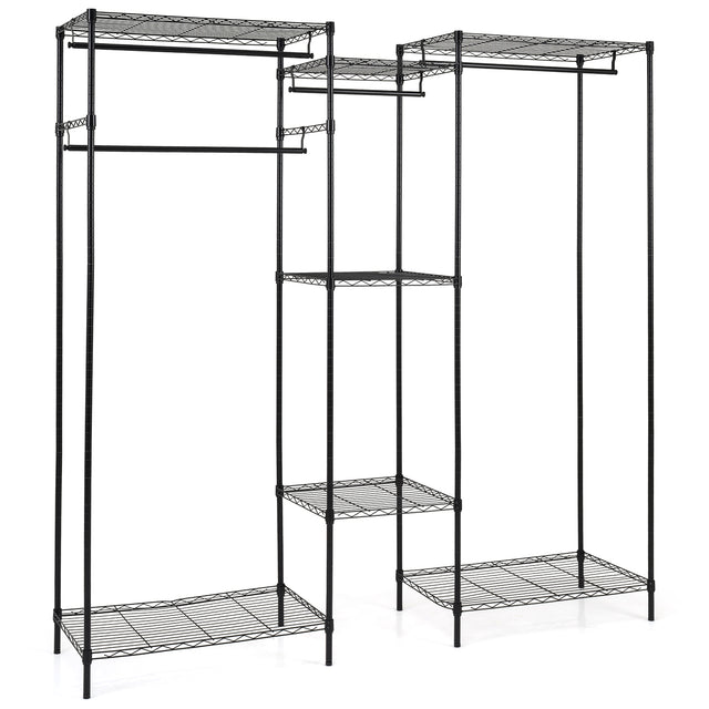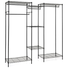 Color Black Material Metal ABS Overall Dimensions 74â x 18â x 78â Dimensions of L-shaped Wardrobe 46.5â x 46.5â x 78â Dimensions of Large Shelf 29â x 18â Dimensions of Small Shelf 18â x 18â Weight Capacity of Large Shelf 180 lbs Weight Capacity of Small Shelf 100 lbs Weight Capacity of Long Hanging Rod 40 lbs Weight Capacity of Short Hanging Rod 30 lbs Net Weight 36 lbs Box QTY 1(May vary by batch) Is Assembly Required Yes Package Includes 1 x Clothes Rack  1 x User Manual