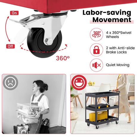 3-Tier Utility Cart Metal Mental Storage Service Trolley-Red