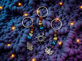 Measuring almost 3 inches long, this chakra keychain looks great on a purse. Your chakra keychain design will be chosen at random by a member of our team, but may include a sun, lotus, mandala, or others.