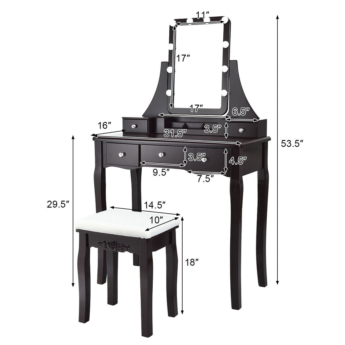 10 Dimmable Light Bulbs Vanity Dressing Table with 2 Dividers and Cushioned Stool - Black is backordered and will ship as soon as it is back in stock.