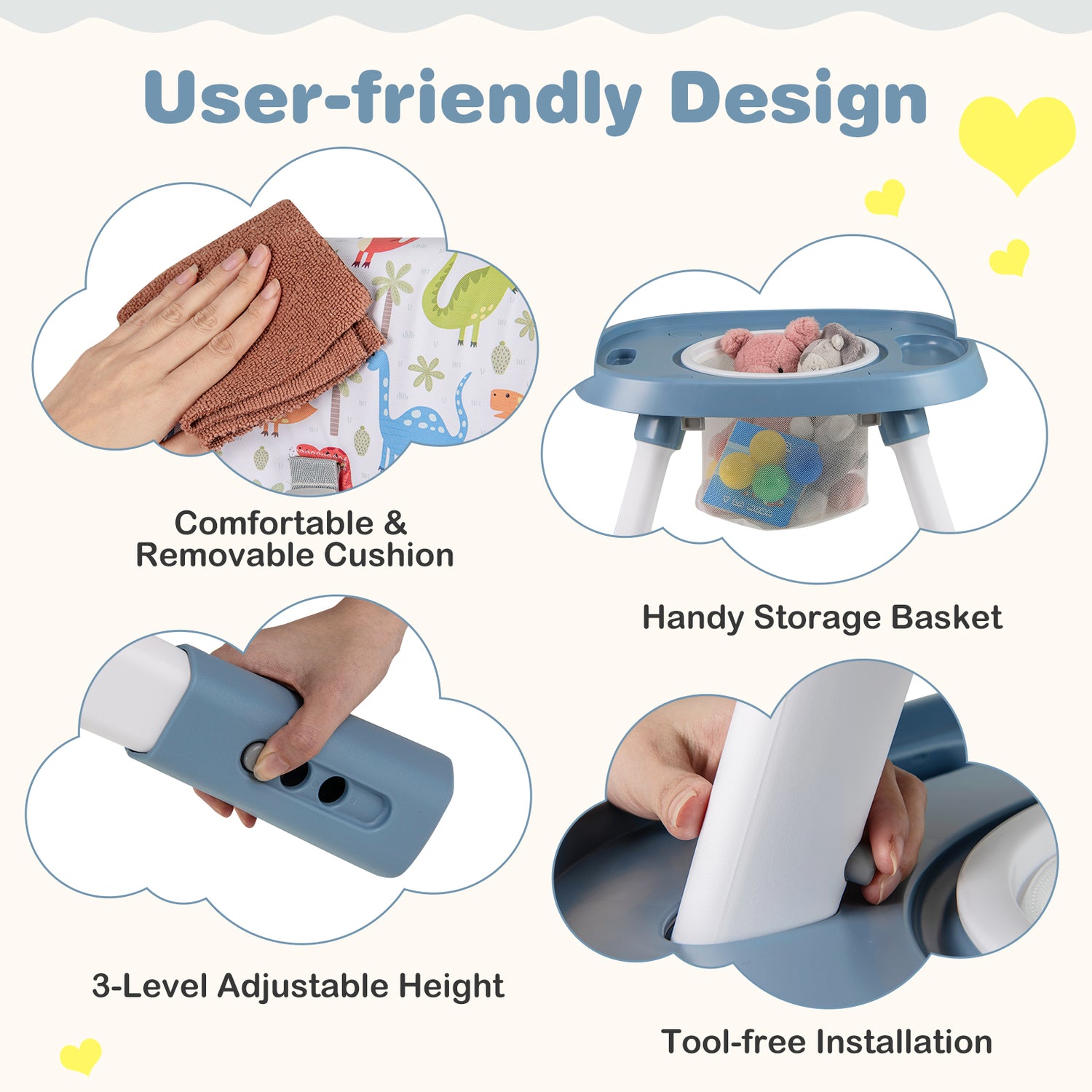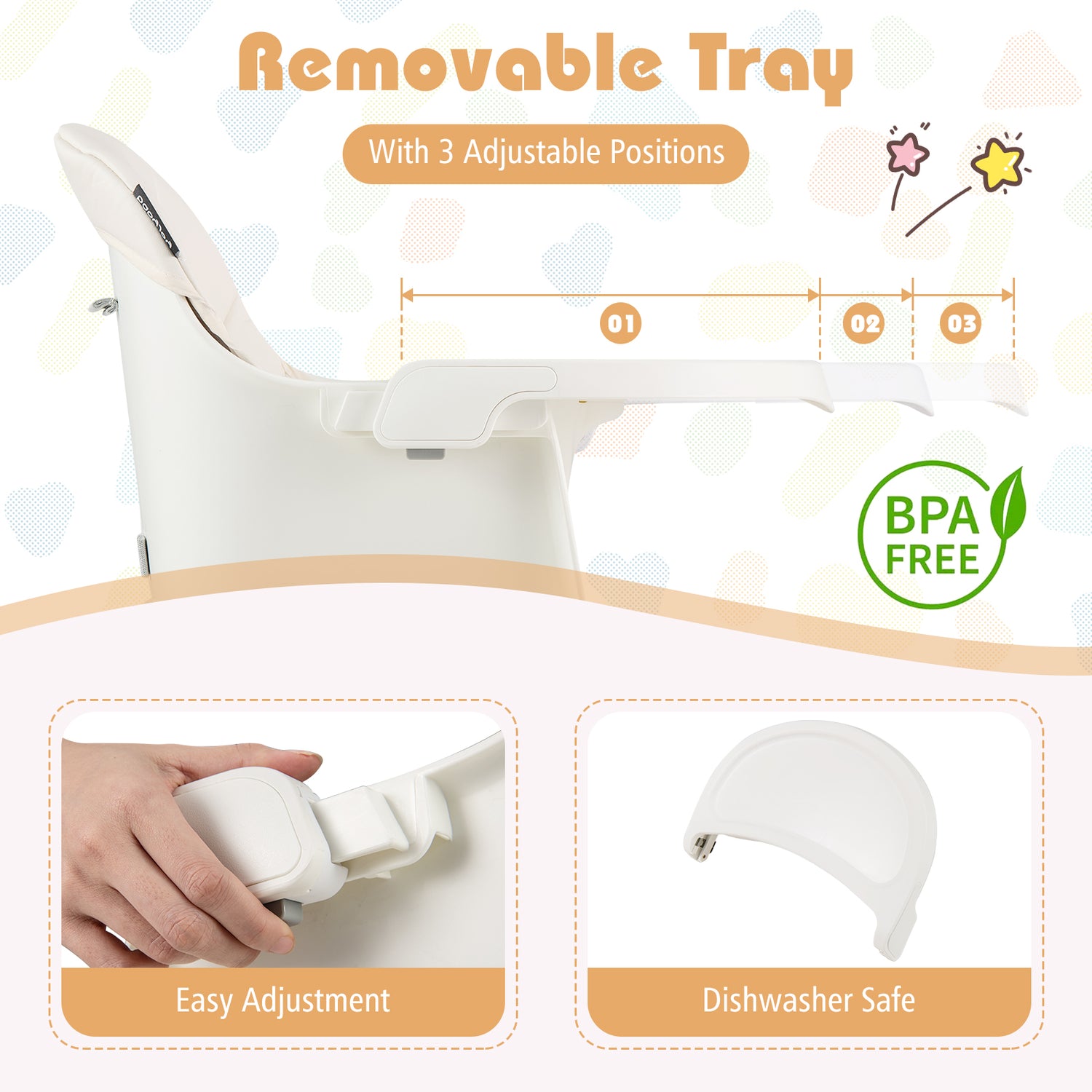 Color Gray/Celadon/Pink/White Material Metal + PP + ABS Highchair Dimension 23.5" x 23.5" x 36.5"-38" Tray Dimension 17" x 8.5" Booster Seat Dimension 15.5" x 14" x 16" Floor Chair Seat Dimension 12" x 9" x 8.5" Activity Center Dimension 23.5" x 19.5" x 16.5"-18" Rotating Seat Diameter 10" Suitable Age 6 months-3 years old Weight Capacity 44 lbs Net Weight 21 lbs Box QTY 1(May vary by batch) Package Includes 1 x Convertible Highchair  1 x User Guide