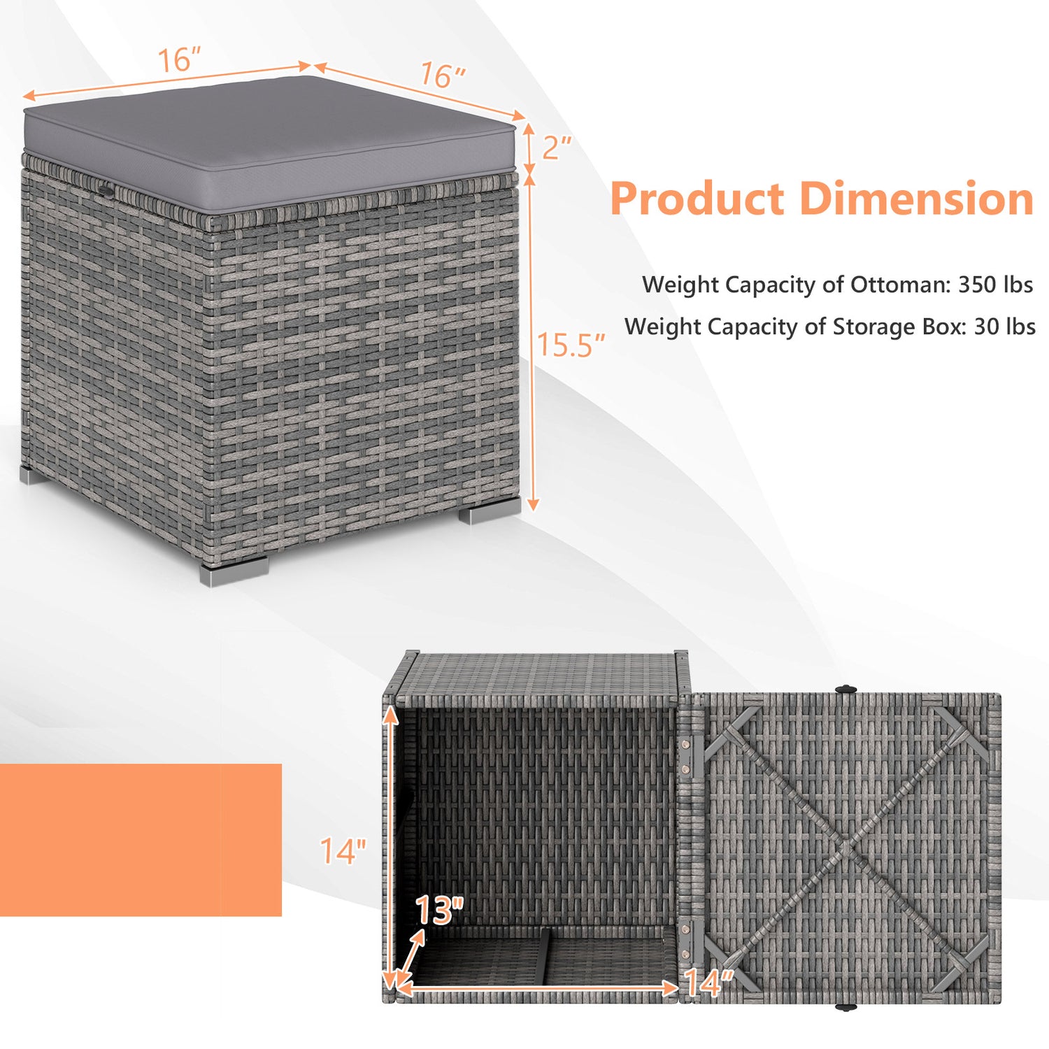 Color of PE Rattan Mix Brown Color of Cushion Beige/Black/Red/Turquoise/Gray/Navy Material Metal PE Rattan Sponge Polyester Dimension of Each Ottoman 16" x 16" x 15.5" Dimension of Cushion 16" x 16" x 2.5" Dimension of Inner Space 14" x 14" x 13" Weight Capacity of Top 350 lbs Weight Capacity of Bottom 30 lbs Net Weight of Each Ottoman 9 lbs Box Qty 1(May vary by batch)