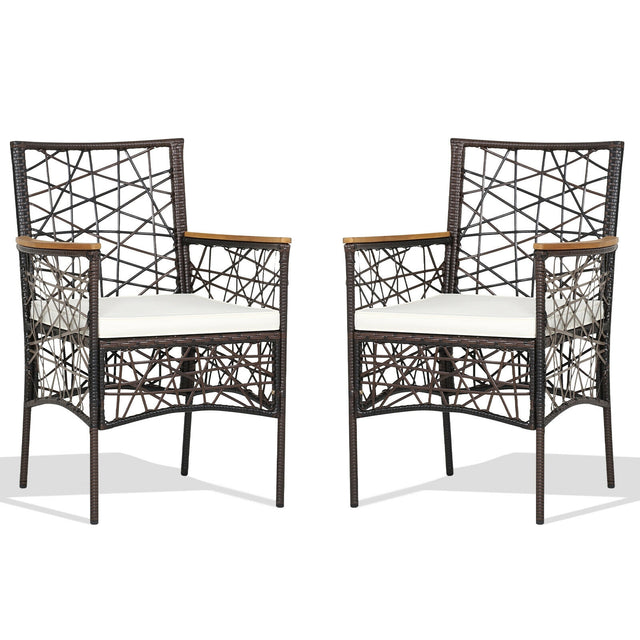 2 Pieces PE Wicker Patio Bistro Dining Chairs with Acacia Wood Armrests and Cushions