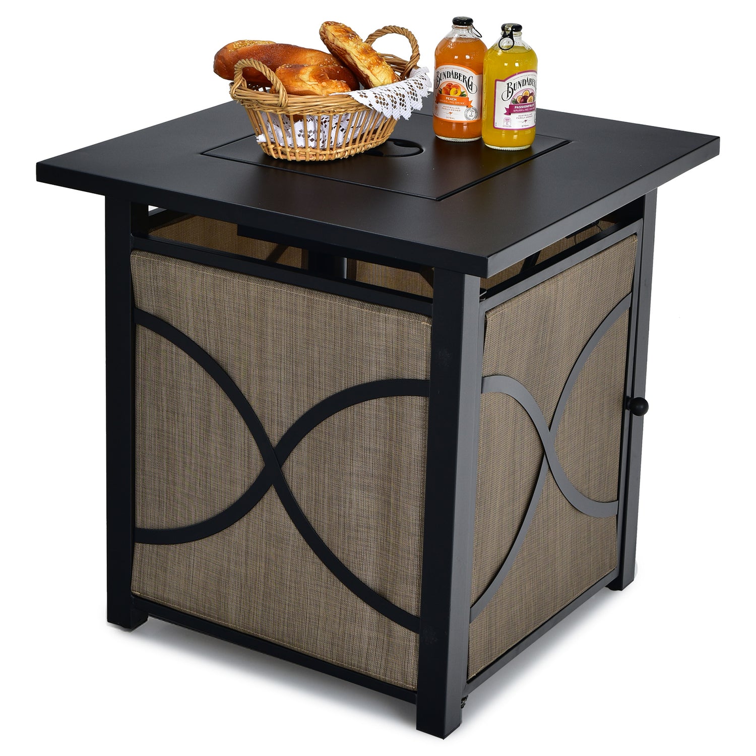 Color: Black coffee Material: Steel stainless Steel fabric Overall dimension: 25" x 25" x 25" (L x W x H) Size of fire bowl: 13.5" x 13.5" (L x W) Net weight: 36 lbs Output: 40000 BTU Box Qty: 1(May vary by batch)Package includes: 1 x Outdoor Fire Table 1 x Fire Glass 1 x AAA Battery 1 x Instruction