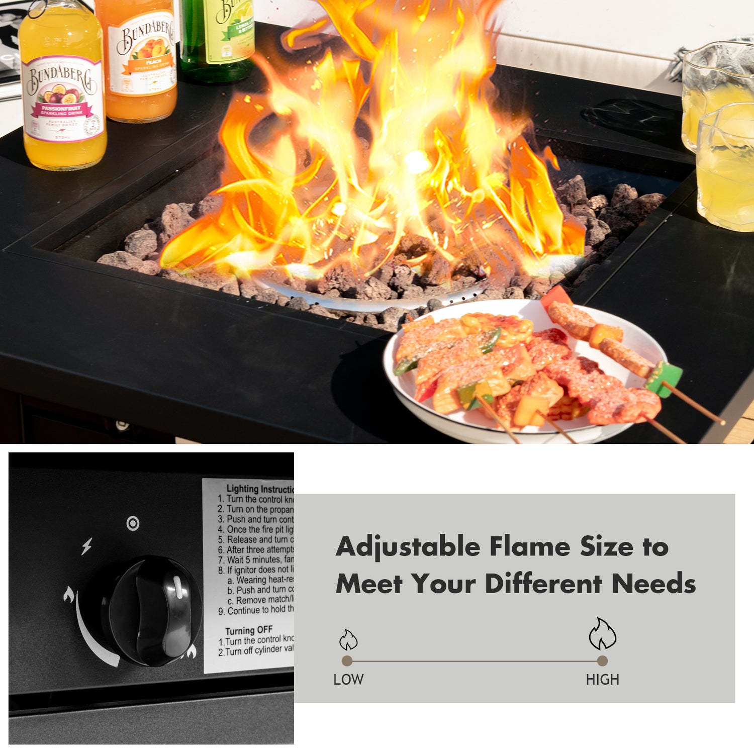 Material: SPCC steel stainless steel Color: Black Net weight: 46lbs Overall size: 28" x 28" x 25.5" (L x W x H) Weight capacity: 75lbs Output: 50 000 BTU Fuel type: Propane gas Burner type: Round tube burner Flameout protectionï¼Yes Flame settings: 2 levels Ignition type: Integrated piezoelectric igniter Box Qty: 1(May vary by batch)Package includes: 1 x Fire pit table with lid 1 x Lava rock set 1 x Instruction