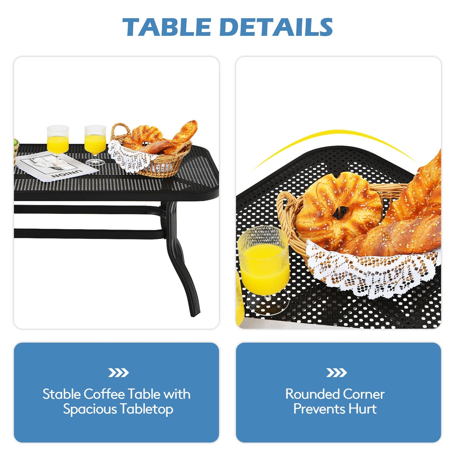 Material: Steel Frame color: Black Cushion color: Beige/Turquoise/Red/Blue Loveseat size: 47" x 29" x 37" (L x W x H) Back cushion Size: 21" x 23" x 4" (L x W x Thickness) Seat cushion Size: 24" x 45" x 4" (L x W x Thickness) Seat height: 14" Table size: 36" x 19.5" x 19" (L x W x H) Weight capacity of loveseat: 550lbs Weight capacity of coffee table: 180lbs Box Qty: 1(May vary by batch)Package includes: 1 x Loveseat 1 x Coffee table 1 x Seat cushion 2 x Back cushion 1 x Instruction
