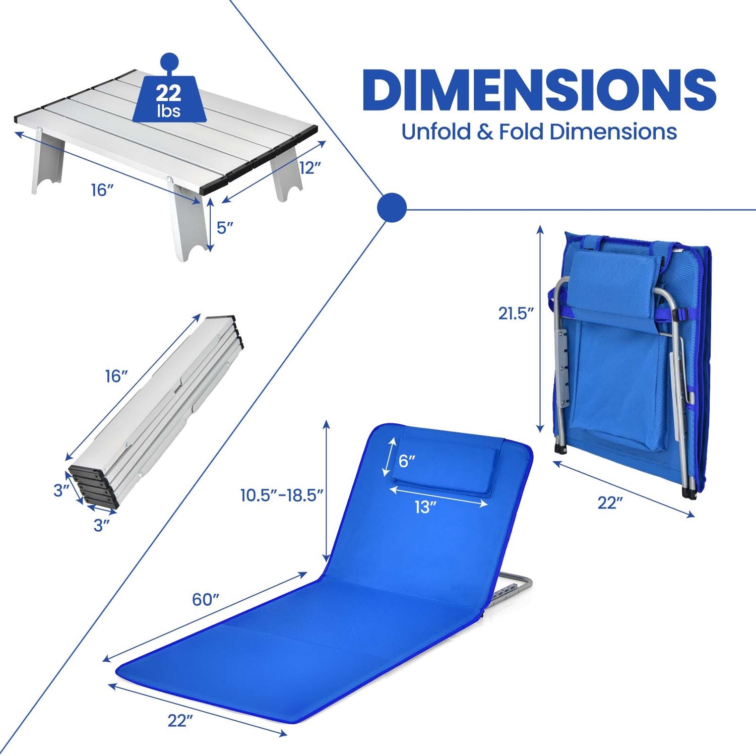 Color: Blue/Stripe/Green Material: Oxford fabric aluminum PP polyester fabric Lounge chair size: 60" x 22" x 10.5"-18.5" (L x W x H) Table size: 16" x 12" x 5" (L x W x H) Folding chair size: 22" x 21.5" (L x W) Folding table size: 16" x 3" x 3" (L x W x H) Weight capacity of the table: 22 lbs Adjustable height: 18.5" / 17.5" / 16" / 14" /10.5" Package included: 2 x Lounge chair 1 x Table 1 x Instruction Box Qty: 1(May vary by batch)