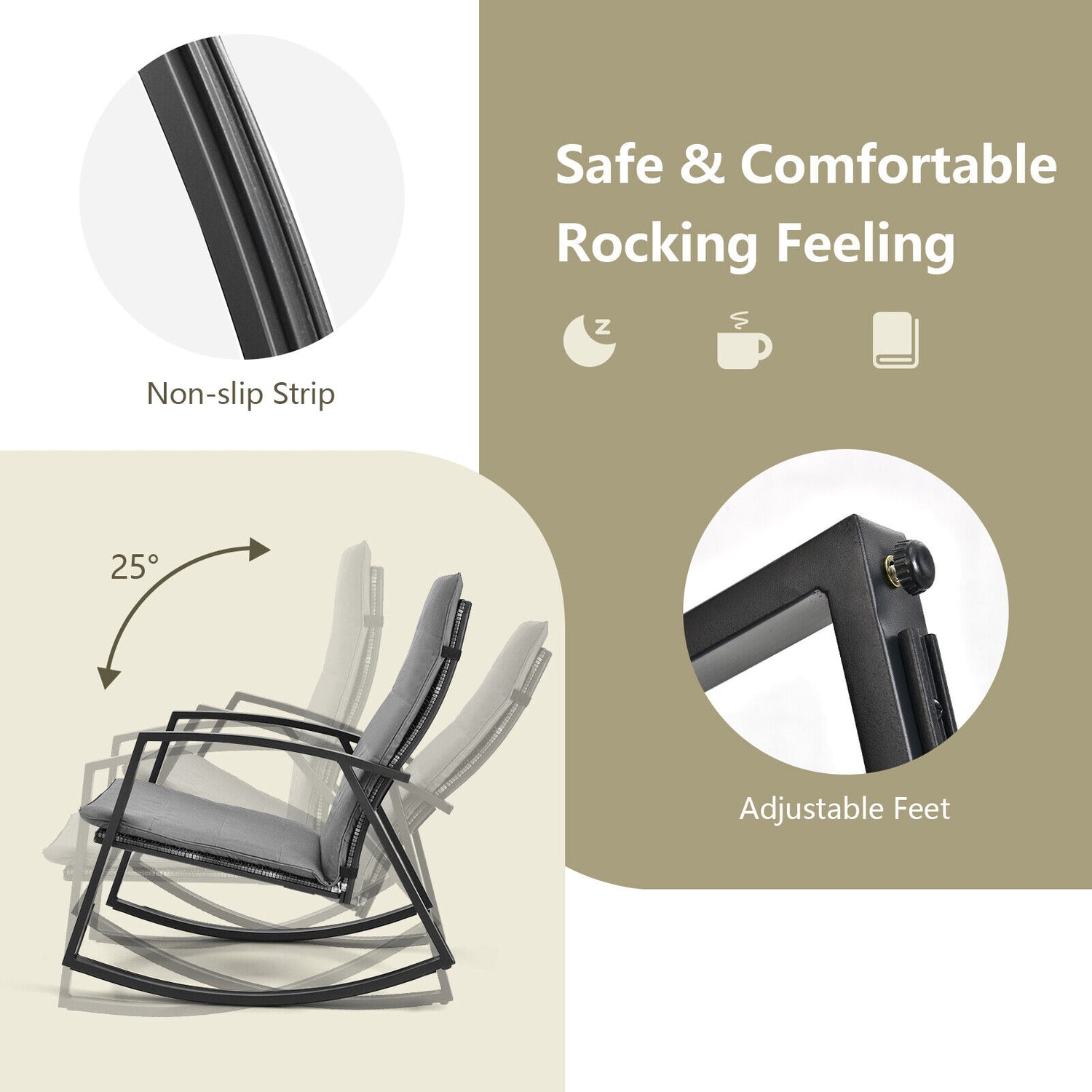 Cushion color: Brown/Gray Material: PE Rattan steel polyester tempered glass PE Rattan color: Mix gray Net weight: 57.5 lbs Single chair dimension: 25" x 40" x 33"(L x W x H) Seat dimension: 22" x 21.5"(L x W) Seat height: 17.5" Table dimension: 17" x 17" x 20"(L x W x H) Cushion dimension: 53" x 23" x 2"(L x W x T) Weight capacity of tabletop: 110 lbs Weight capacity of each chair: 330 lbs Box Qty: 1(May vary by batch)Package includes: 2 x Rocking chair 2 x Cushion 1 x Table