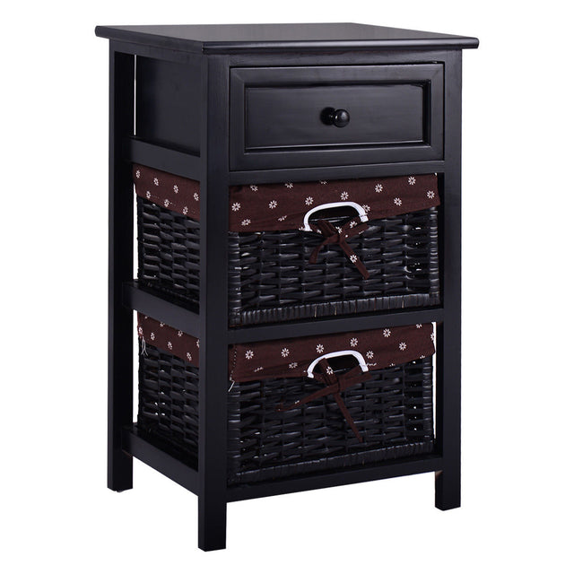 3 Tiers Wooden Storage Nightstand with 2 Baskets and 1 Drawer-black
