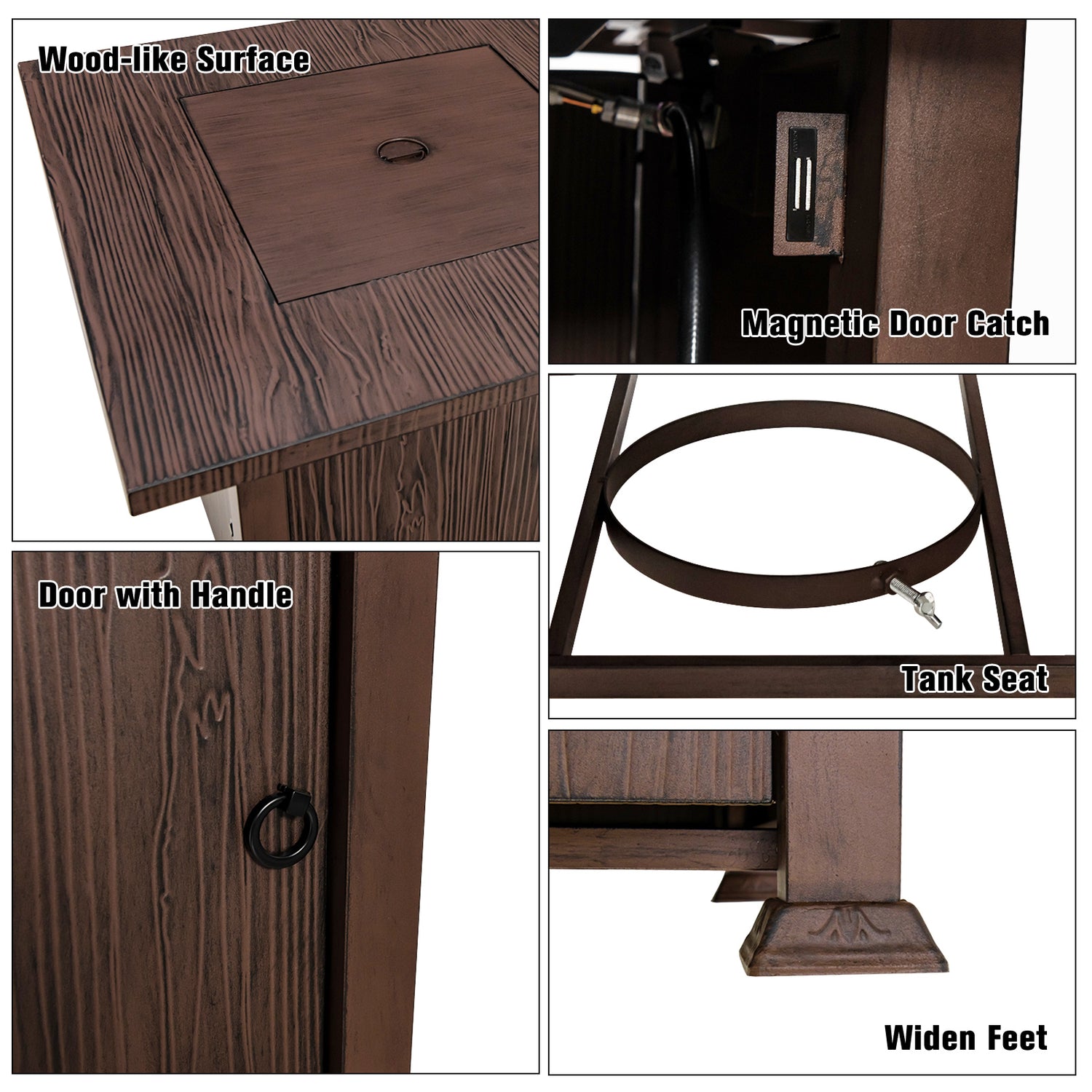 Color Brown Material Metal Stainless Steel Overall Dimension 32" x 32" x 25" Weight Capacity of Tabletop 220 lbs Net Weight 60 lbs Output 50 000 BTU Box Qty 1(May vary by batch)