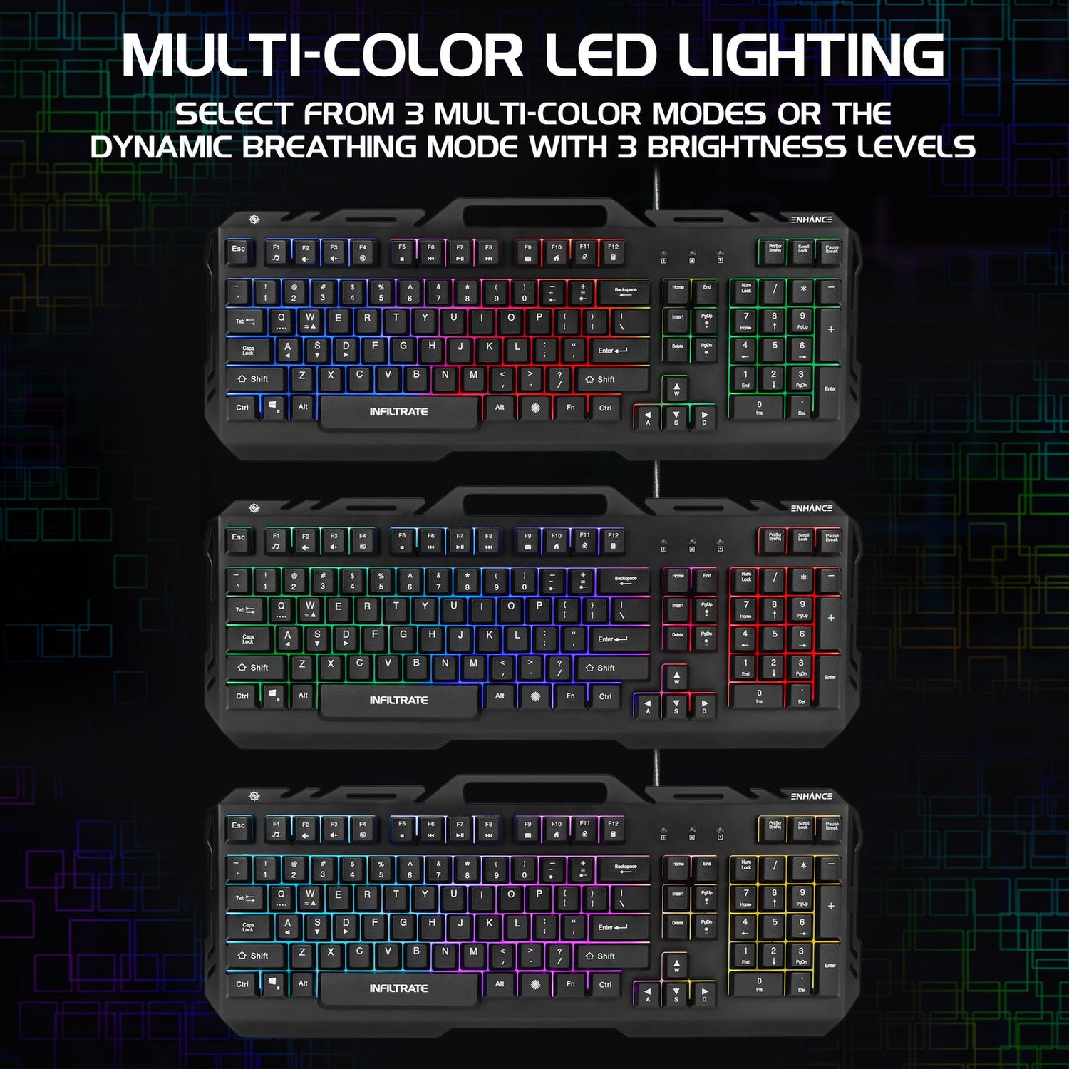 Enhance Infiltrate KL2 Membrane Gaming Keyboard – Multi-Color LED – Metal Build – Quiet Switches